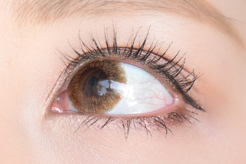 アップにして見てみると、そこまでイエロー感は強くないのですがライトブラウンが裸眼によく馴染んでハーフ系な瞳になれているのに、淡いカラーリングのおかげでナチュラルさもあります。
